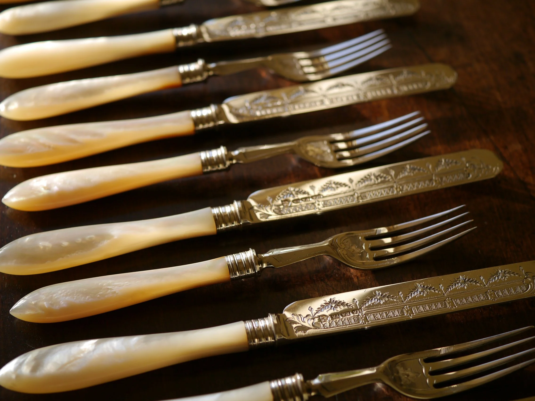 スプーンやフォークのカトラリー類は時代が古くなればなるほどセットのものであっても個々の重さにバラつきが見られます。特に古い時代にはほとんどが手作りであったため、作られた当初からセットで作られたカトラリーにも個々の重さに若干の誤差があったと考えられます。また、長い時を経てくる間に、過去の持ち主がセットのカトラリーの中のいくつかだけを頻繁に使用した場合、それは摩耗が進み軽くなってしまいます。なので古いスプーンやフォークのセットを手にしたとき微妙に重さにバラつきがあるのはごく普通のことです。そういう違いを個性として見るのもアンティークの楽しみのひとつ だと思います。
