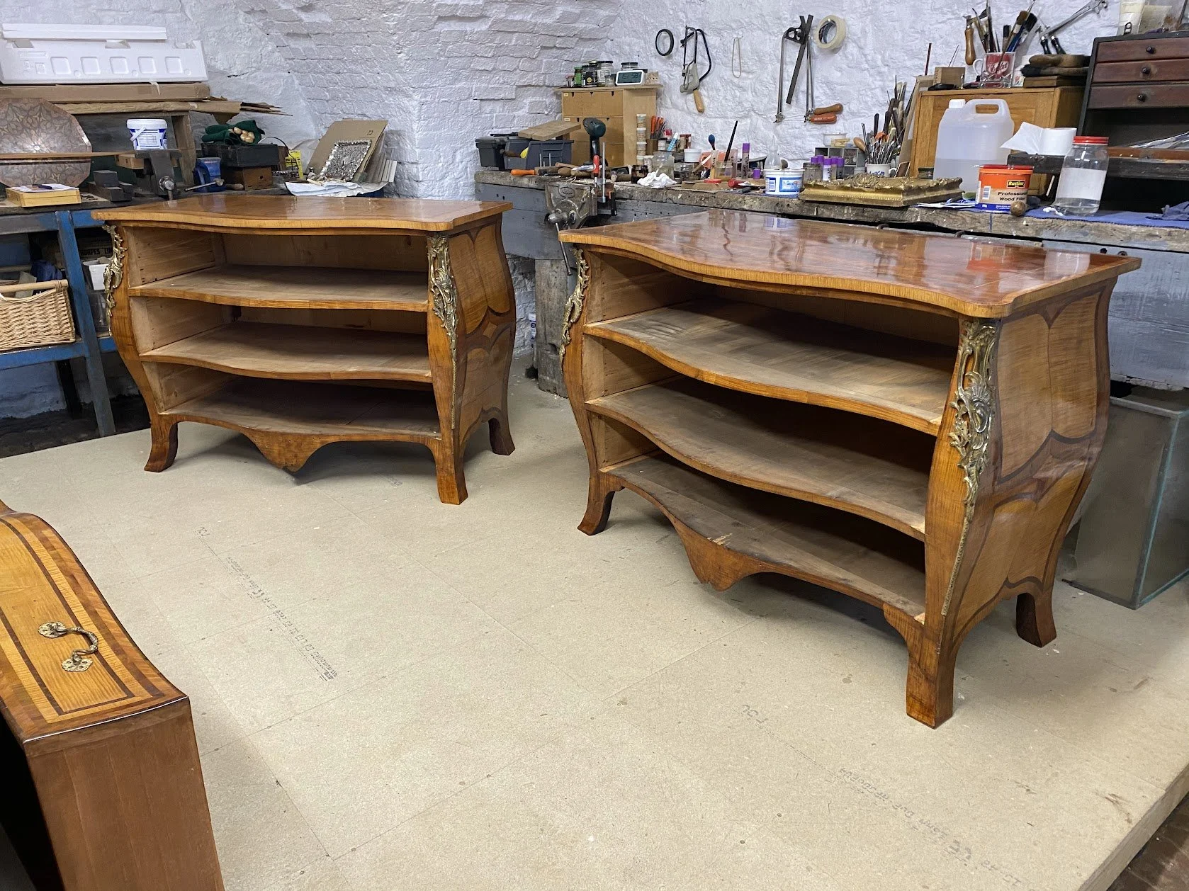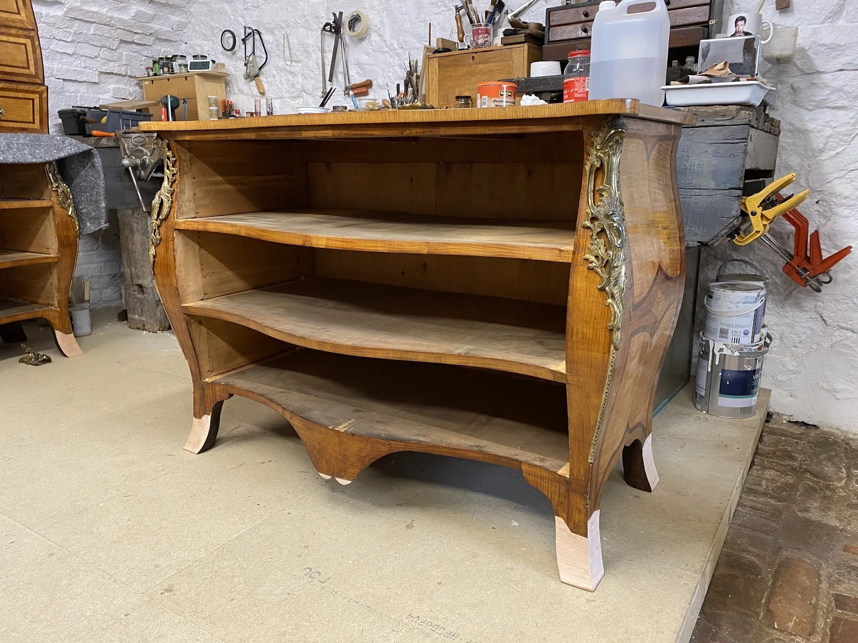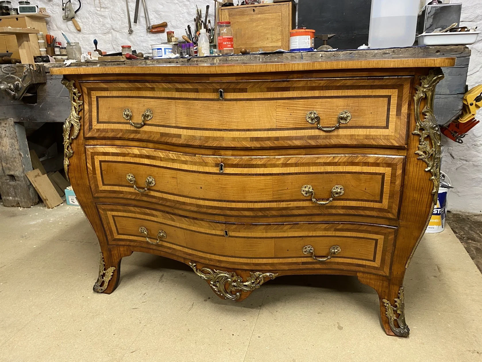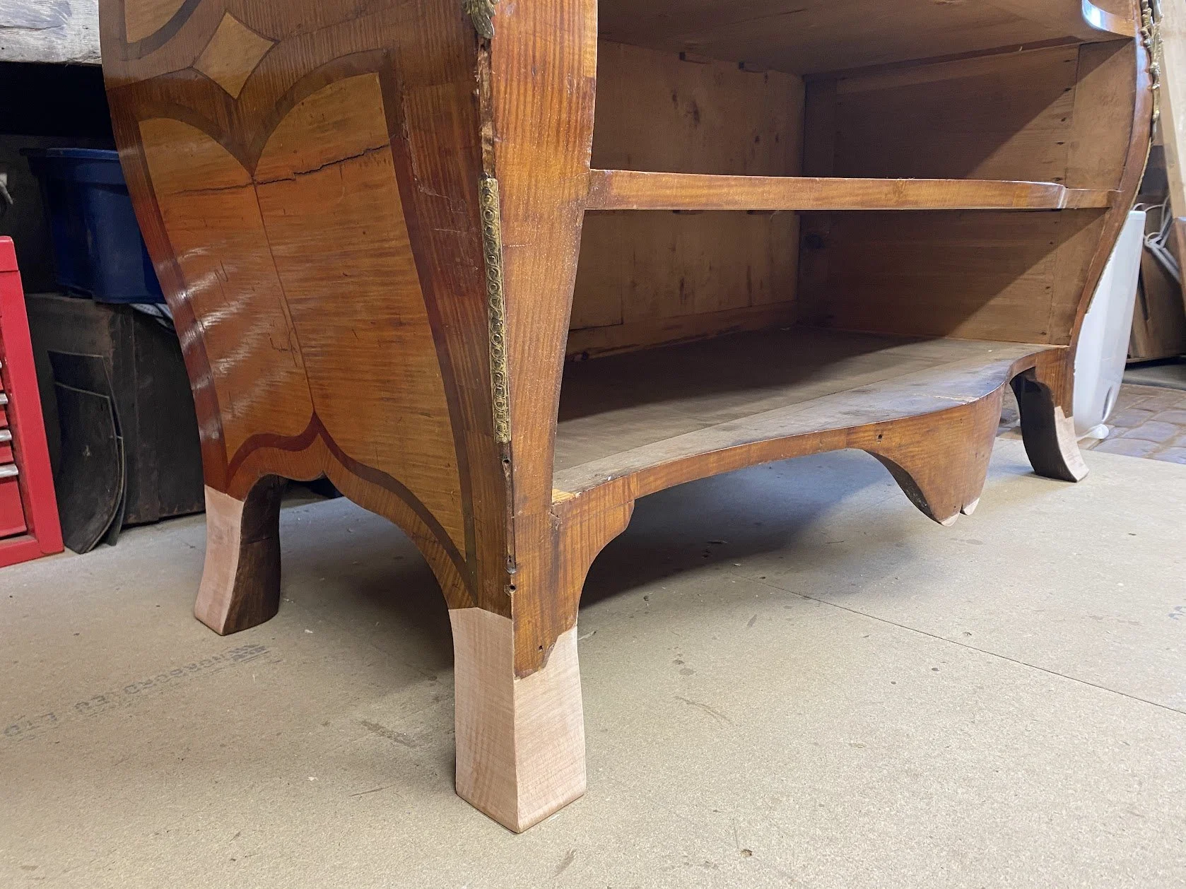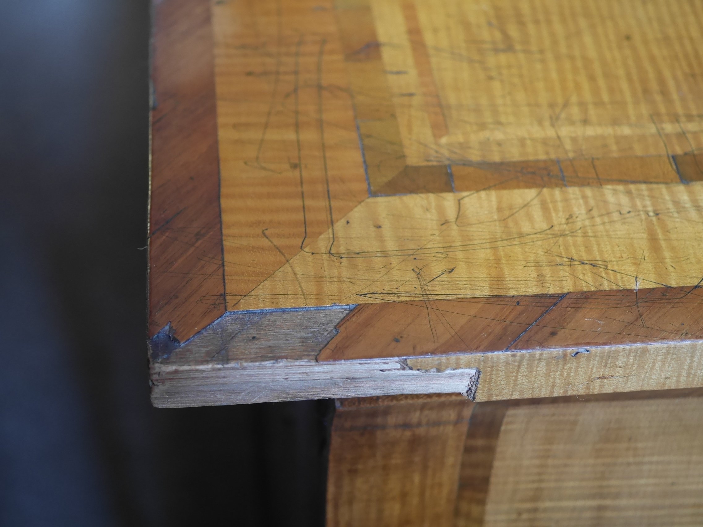 The bracket feet of these commodes had been cut down and the gilt-bronze mounts had been moved. In order to restore them to their original form, I created a new shaped bracket foot and then veneered the surface in harewood (sycamore).