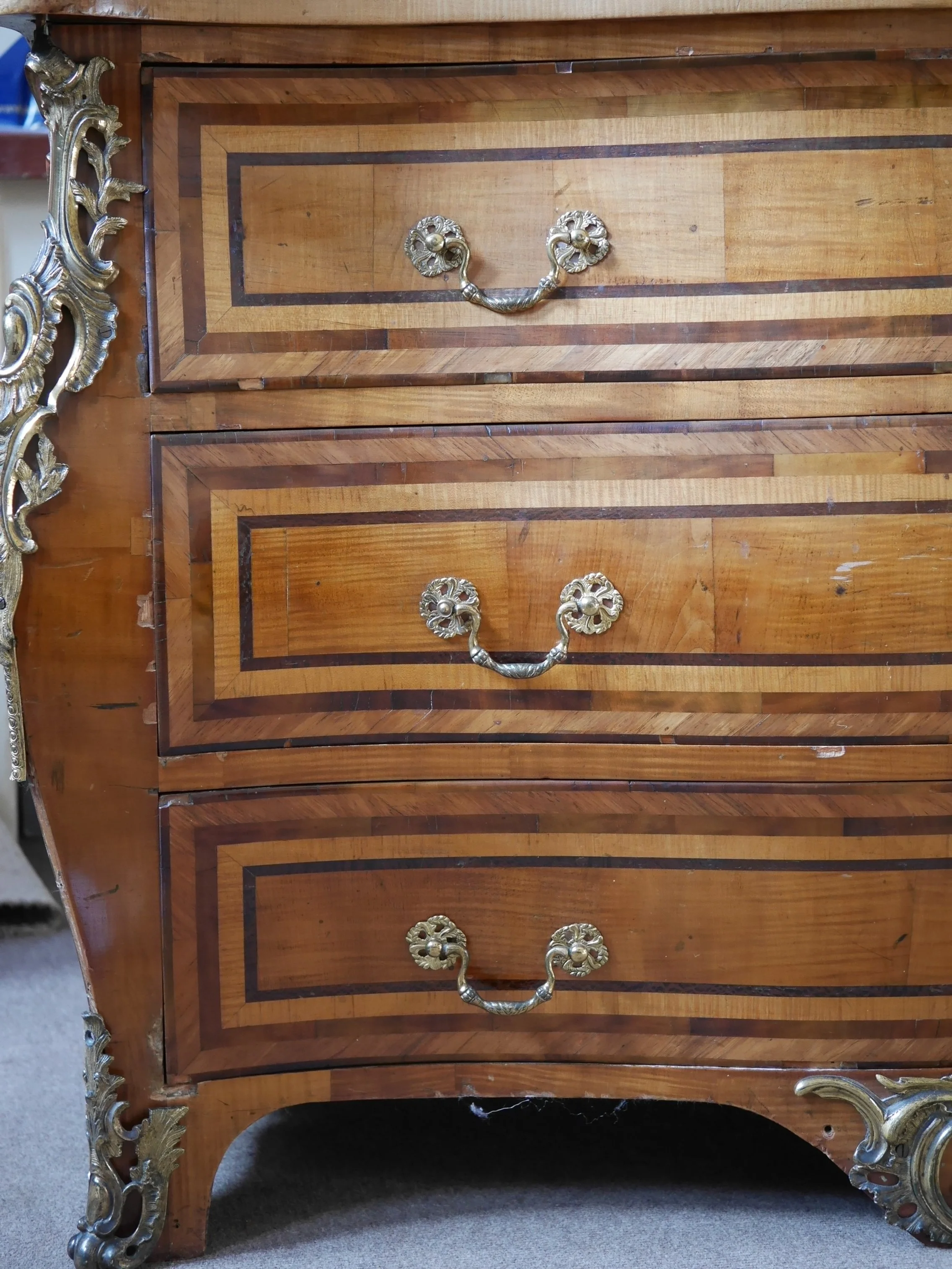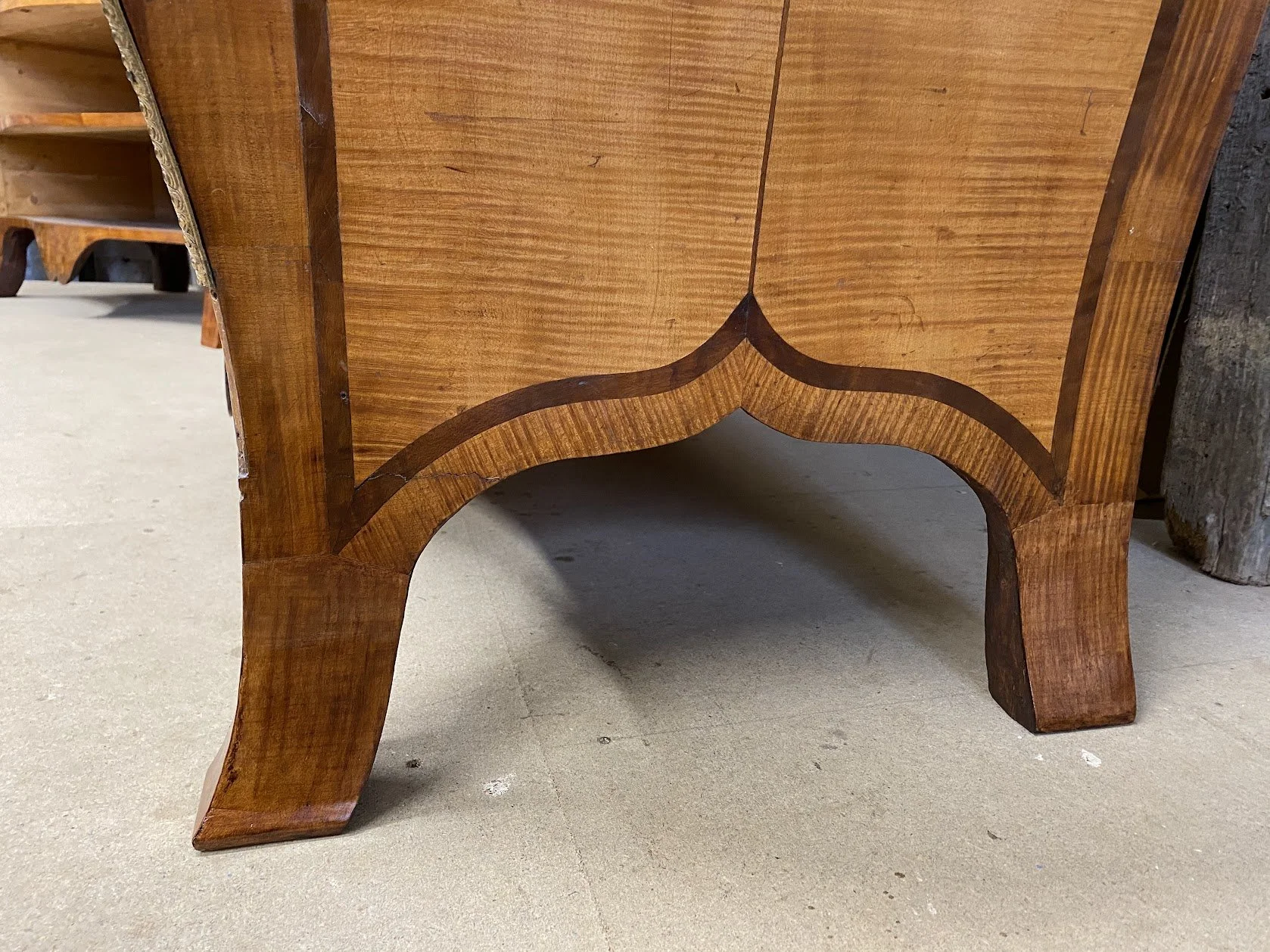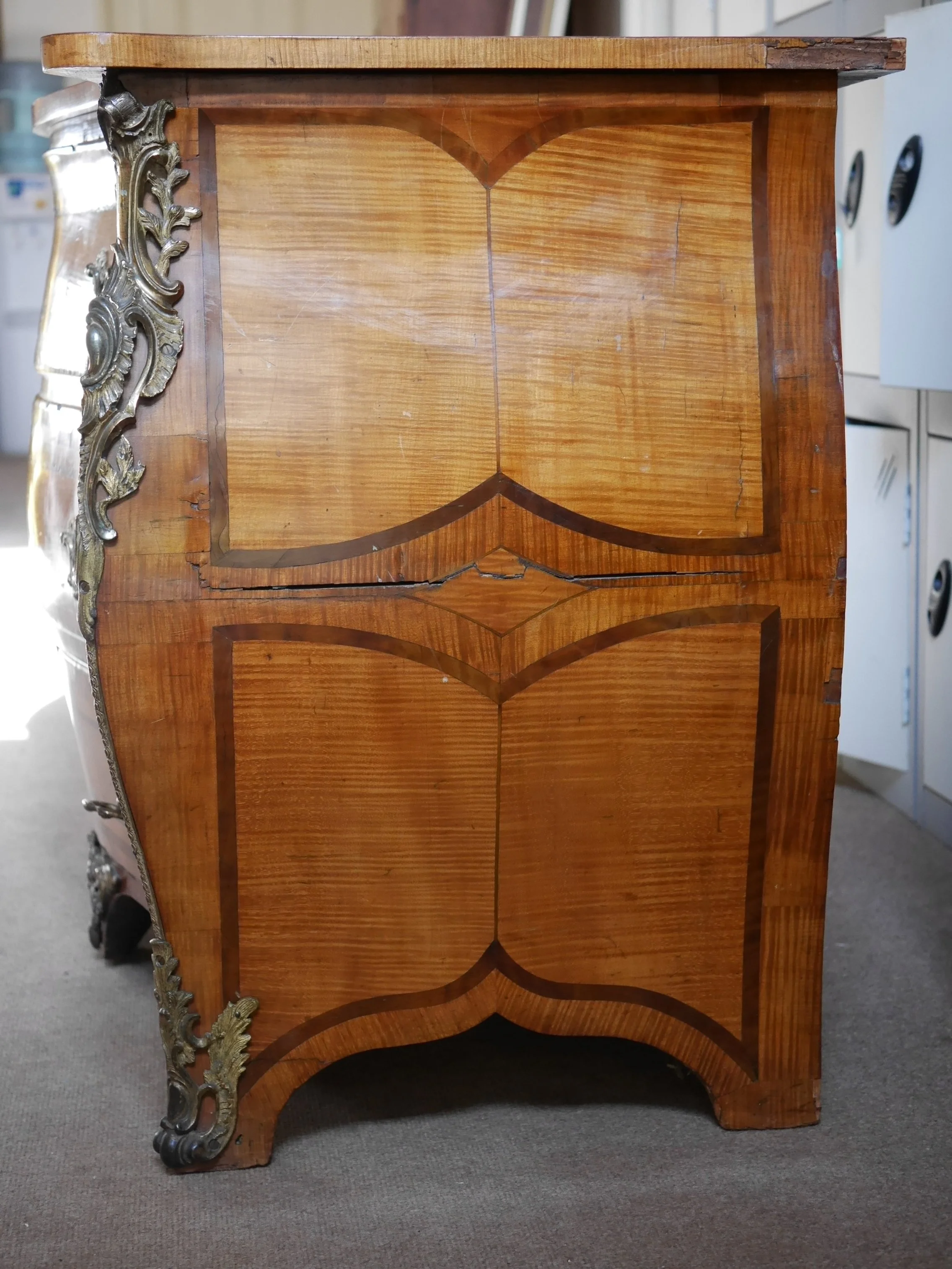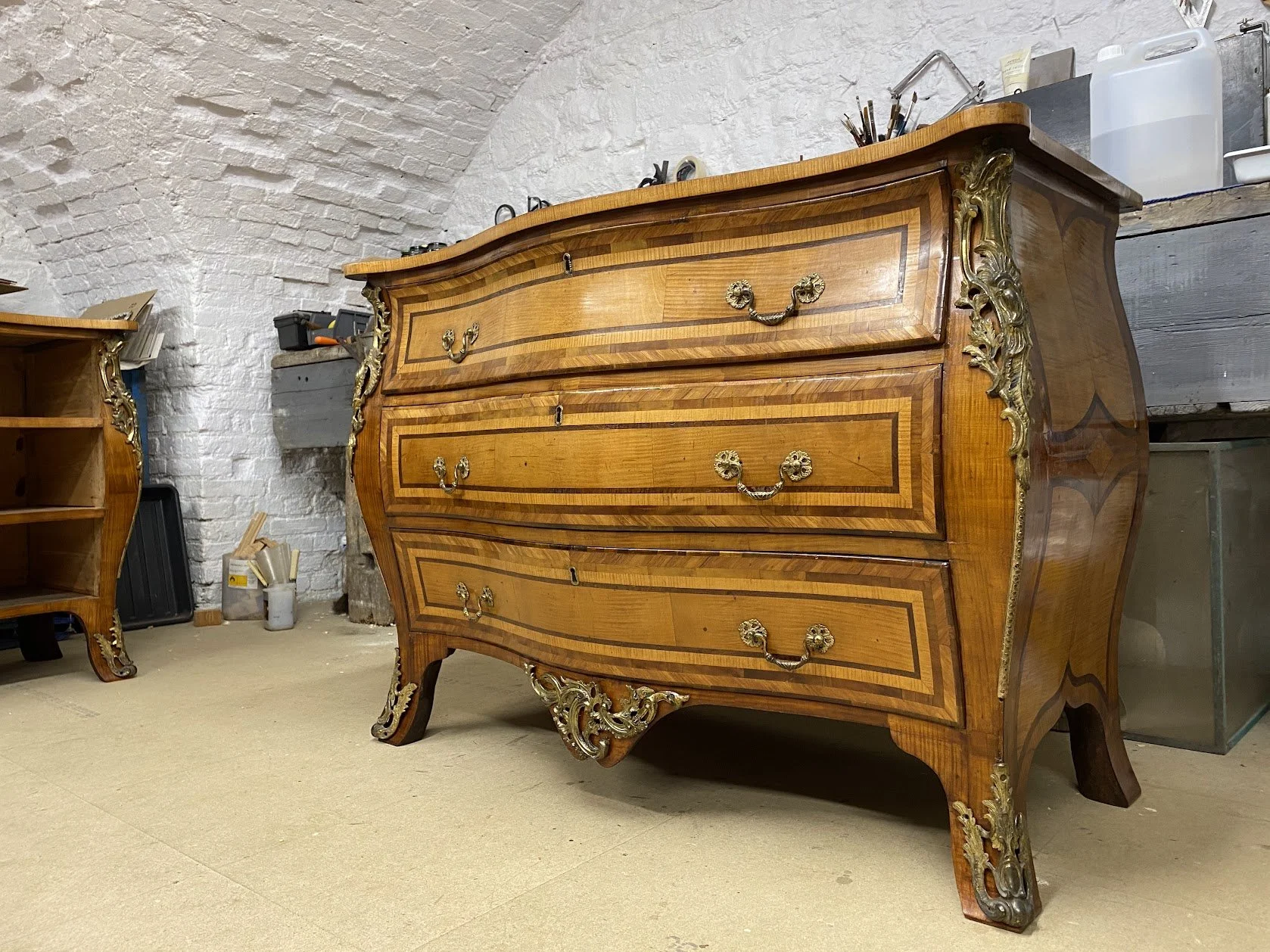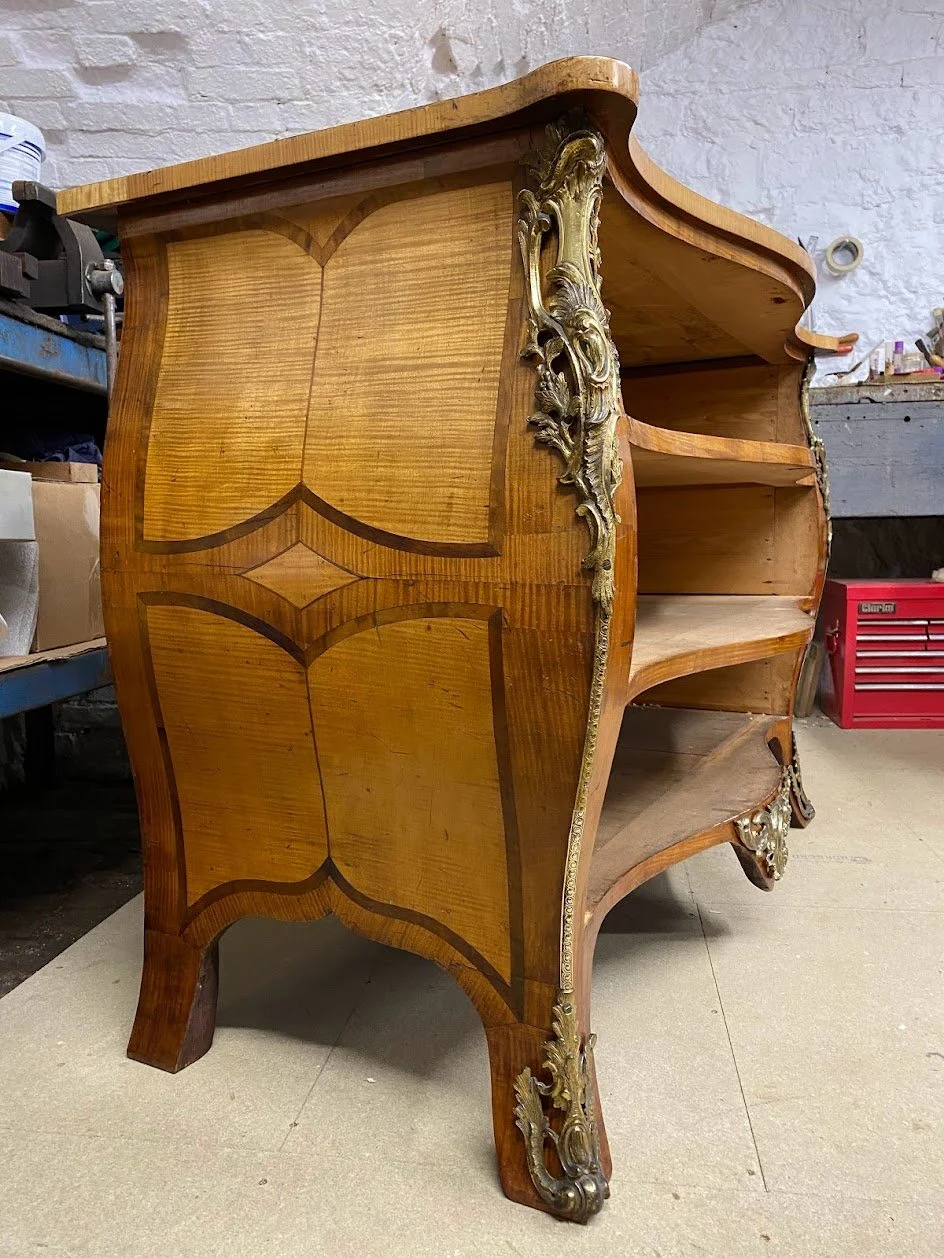 The bracket feet of these commodes had been cut down and the gilt-bronze mounts had been moved. In order to restore them to their original form, I created a new shaped bracket foot and then veneered the surface in harewood (sycamore).