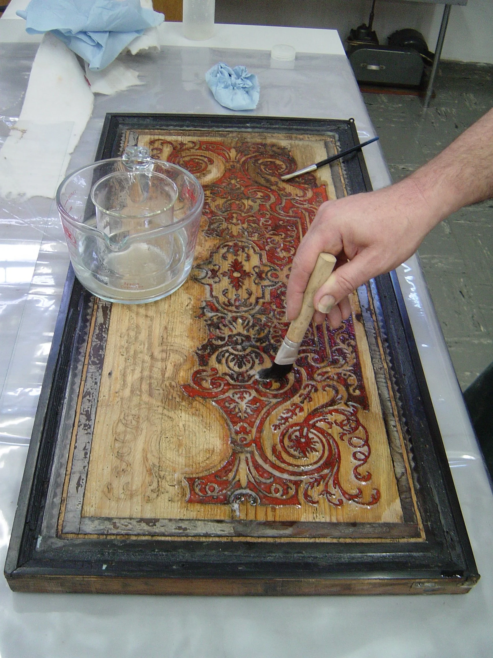 かなり状態が悪く表面の装飾の剥離と紛失、そして下地木材の割れも見られました。全ての浮いた装飾を外しクリーニングし紛失箇所を昔と同じ方法で作成、下地の我の修復、膠を使い接着し磨き上げる作業です。メインは正面のドアの装飾ですが真鍮装飾のクリーニング、サイドの化粧材の貼りなおし、内側の修復などほぼ全ての面の大掛かりな修復プロジェクトでした。
