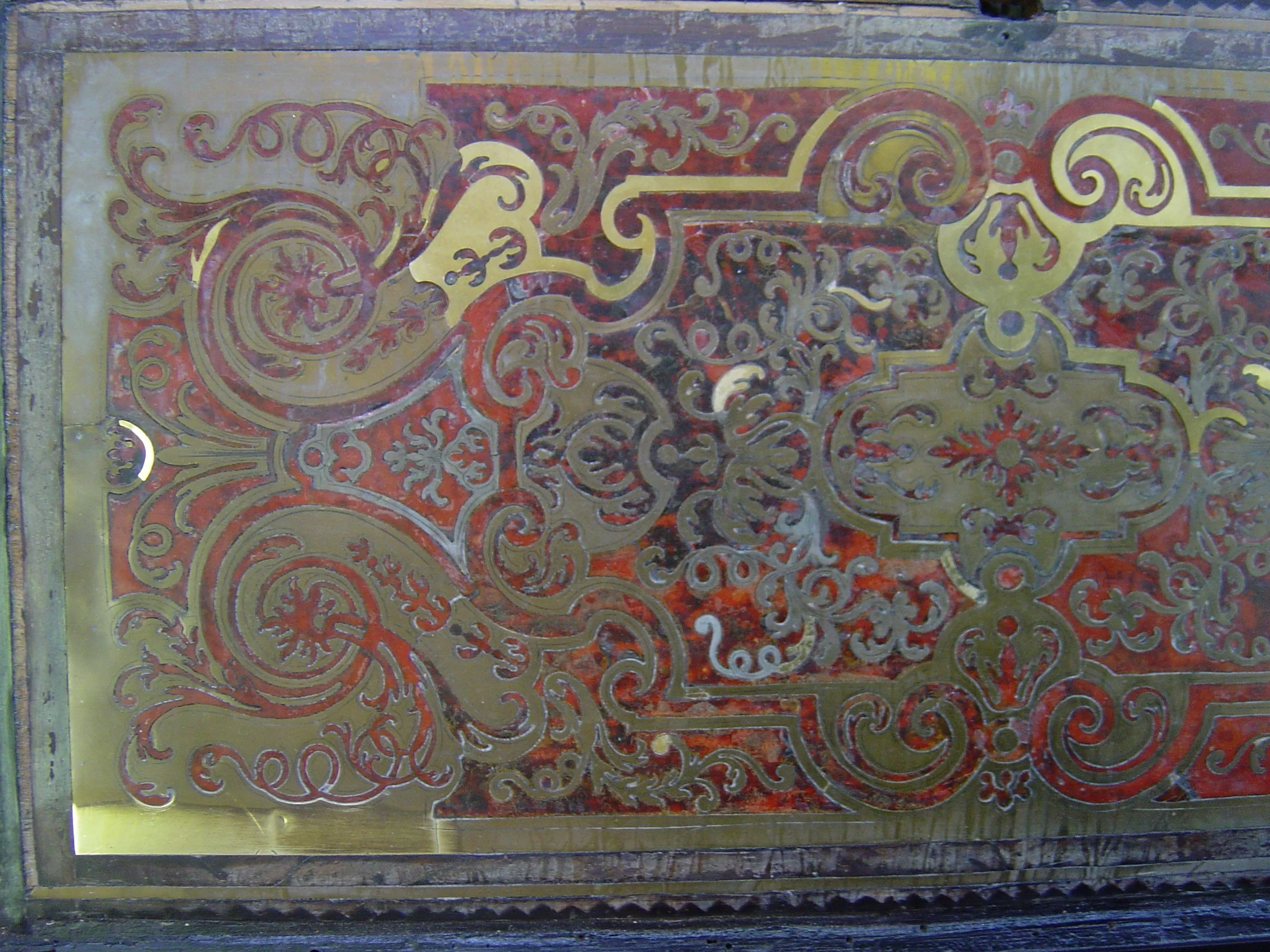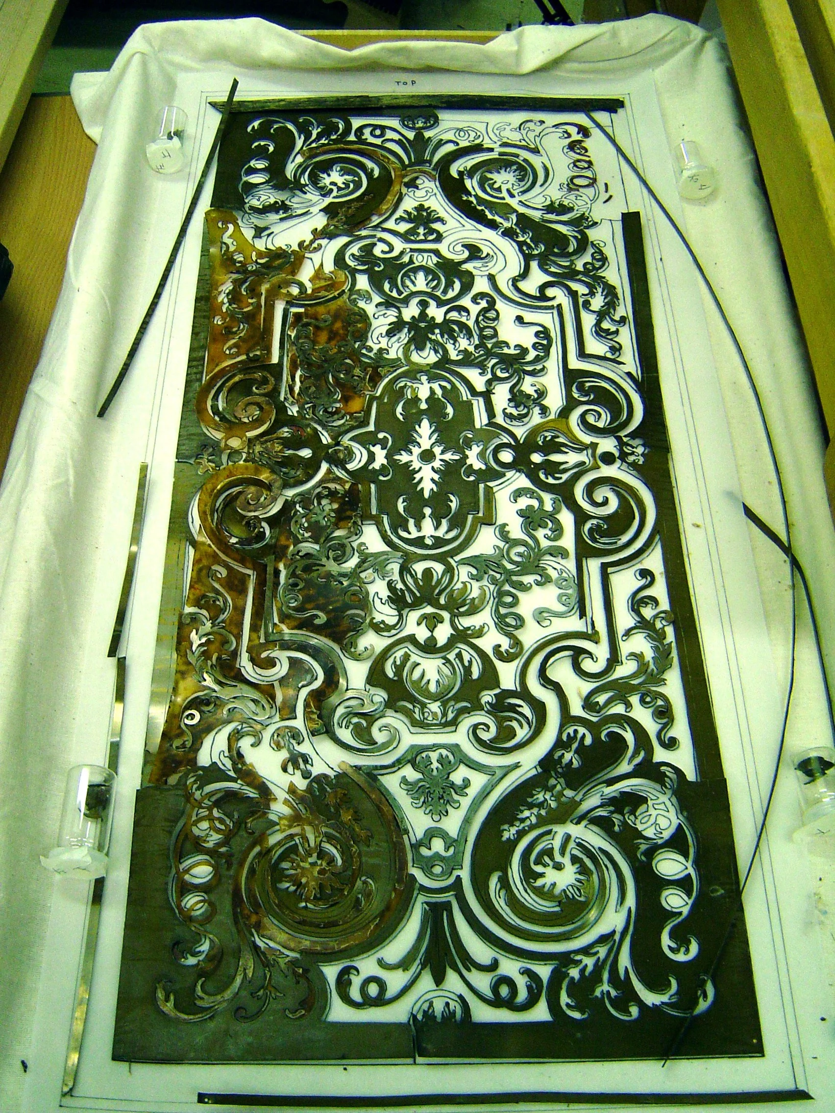 修復中 剥がした装飾を戻し、紛失した鼈甲と真鍮を作り接着作業