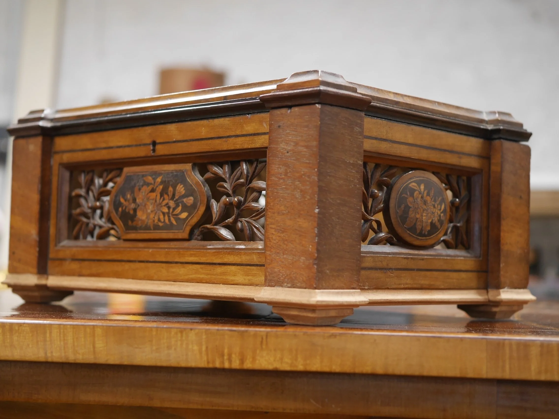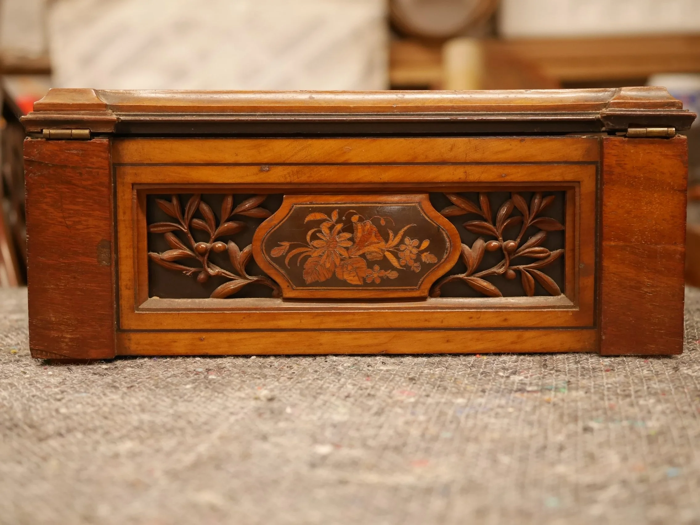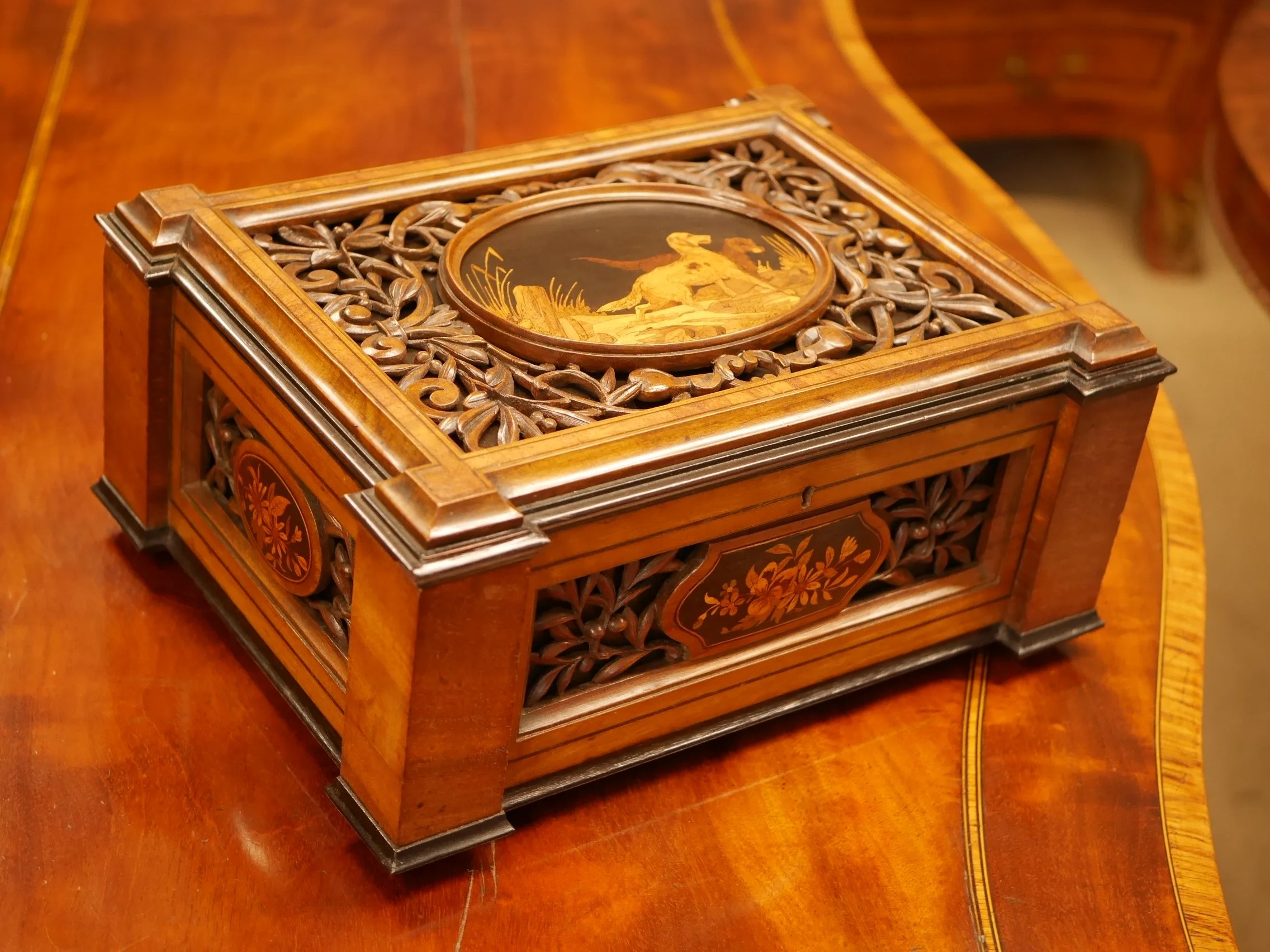 彫刻とマーケトリーが施されたフランス製の箱