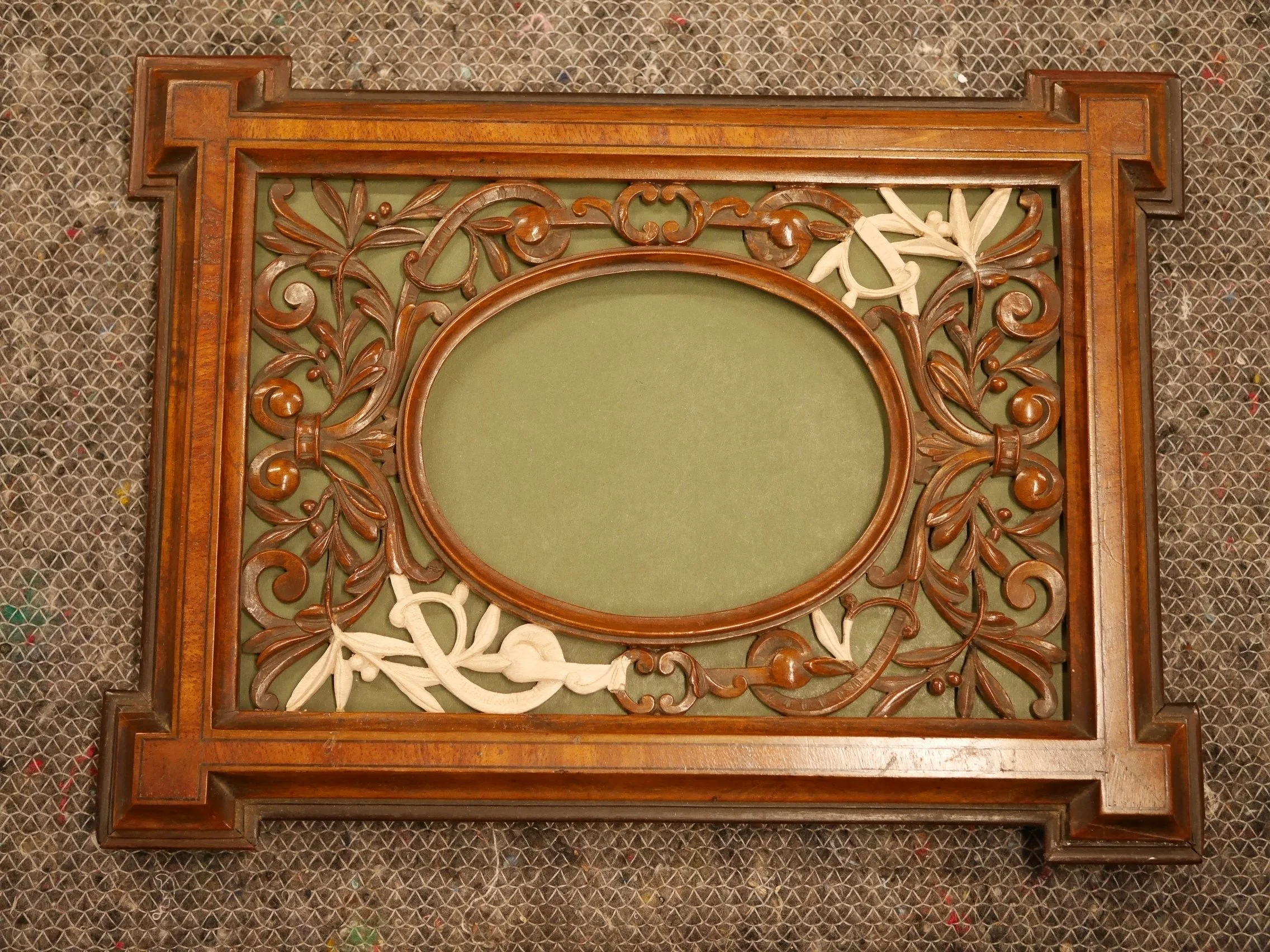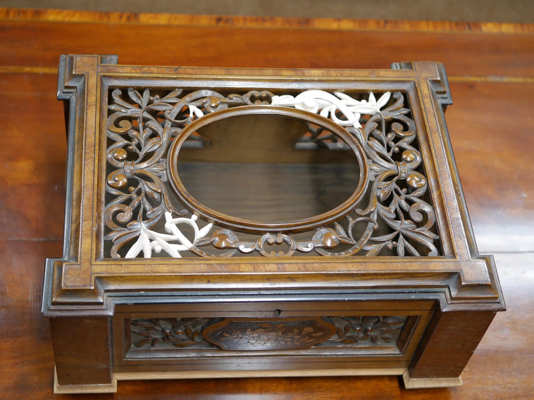 まず、緩んだ接合部、ベニア板、彫刻をすべて膠で接着し直しました。その後、失われた彫刻部分、欠けたベニア板を木材で作り直し、欠損していた底の部分(モールディングと脚)全体を作り直し再現しました。