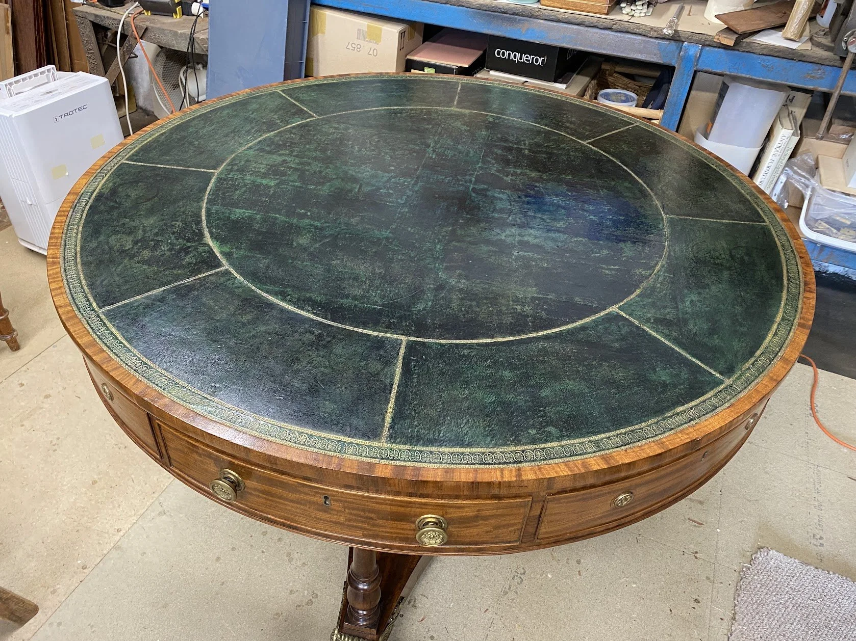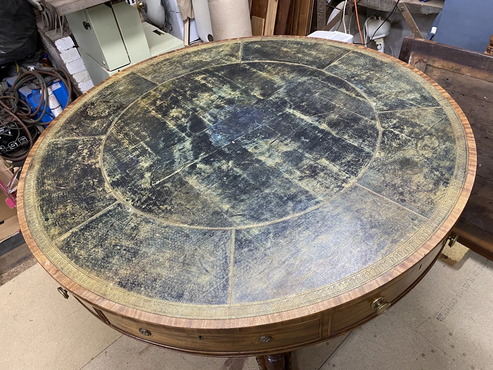 私の拠点であるバーリーハウスから車で1時間ほど離れた場所のマナーハウスのオーナーからの修復依頼で現地へ家具を見に行きました。19世紀初頭にそのマナーハウスのために作られたライブラリードラムテーブルでトップにはられたオリジナルの革の保存よりの修復依頼。日光の光と使用によって色褪せ、カップや花瓶などを置いた際に濡れた跡があります。工房に持ち帰りサイドの色褪せた木の部分の塗装のし直し、革の修復をおこないました。